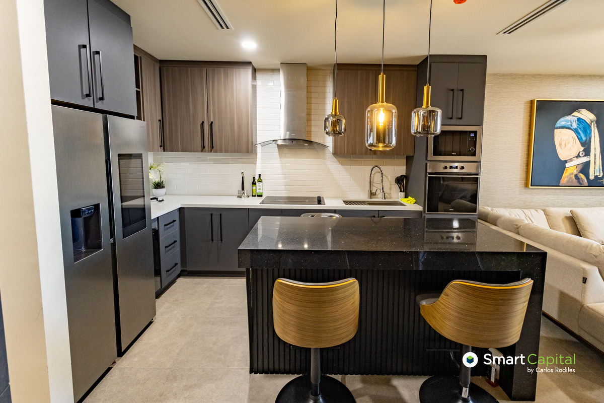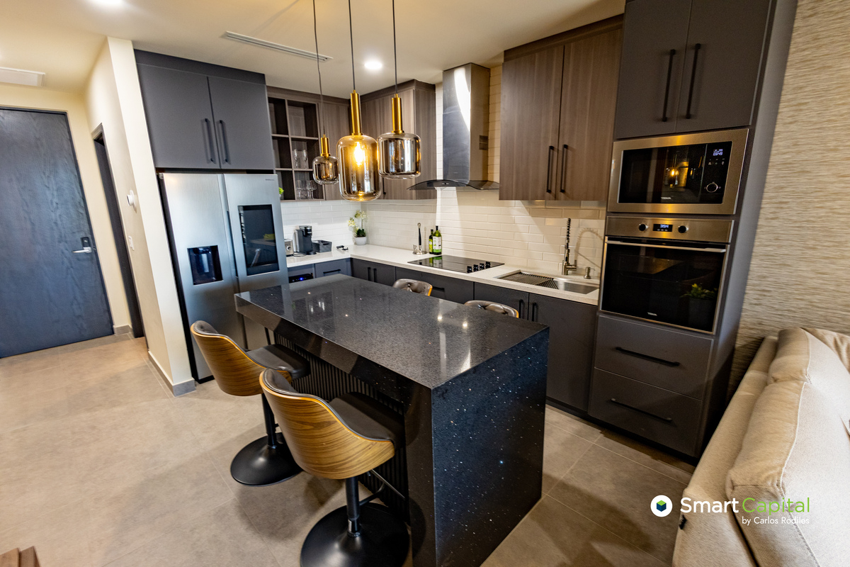 Totalmente equipado y decorado, cocina integral funcional y sobria lista para un cenas de 4–6 personas sin invadir la sala. Es el punto de encuentro que sostiene la estética del conjunto.