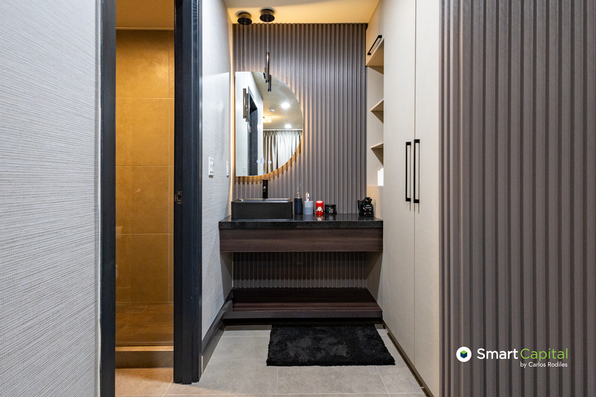 Un condominio de dos recámaras y 2.5 baños resueltos en una sola planta. La principal se aísla del tránsito social; la secundaria se adapta a huésped o estudio. El cuarto de lavado mantiene la casa en su sitio: todo donde debe estar.